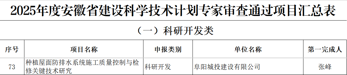 近日,安徽省住房和城鄉建設廳公示了2025年度安徽省住房和城鄉建設科學技術計劃項目名單,城建公司牽頭承擔的種植屋面防排水系統施工質量控制與檢修關鍵技術研究成功入選。